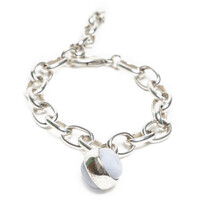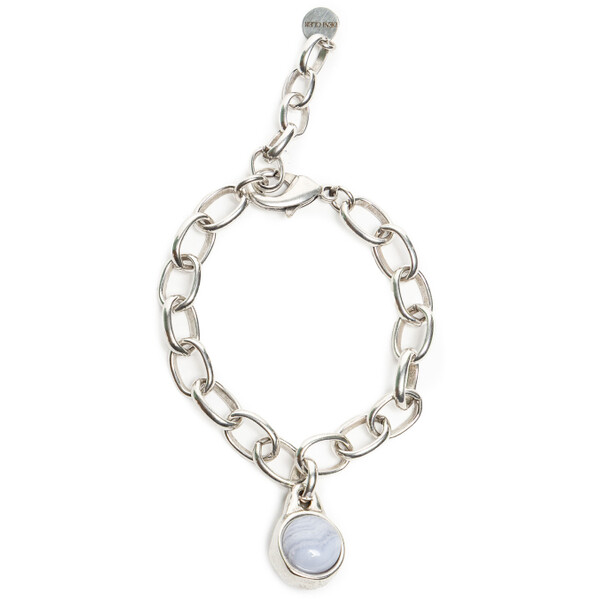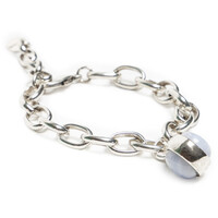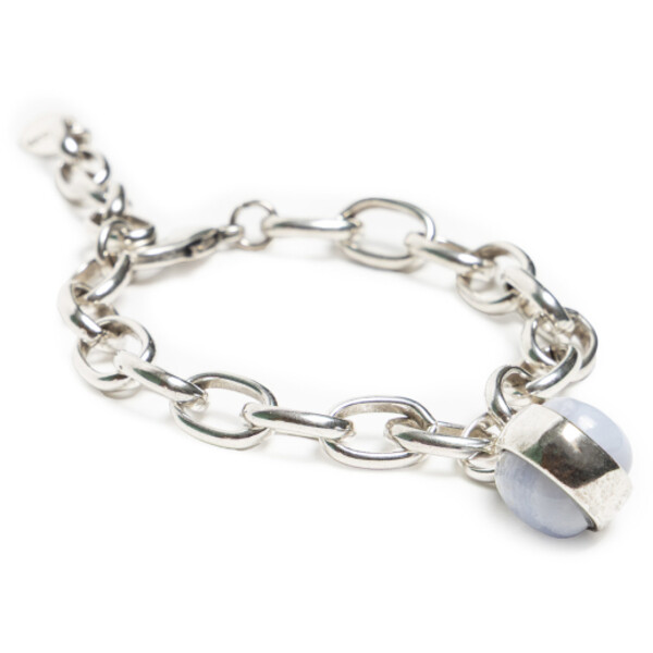 Bransoletka z łańcuchem i mlecznym kamieniem Elegancka bransoletka wykonana z grubych ogniwek łańcucha pokrywanych srebrem próby 925. Centralnym elementem jest duży, eliptyczny kamień w mlecznym kolorze, który pięknie kontrastuje z błyskiem srebra, nadając całości wyrafinowany i romantyczny charakter.Projekt nawiązuje do klasycznych, biżuteryjnych wzorów, ale w nowoczesnym wydaniu, dzięki czemu bransoletka pasuje zarówno do codziennych, jak i okazjonalnych stylizacji. Dobrze komponuje się z naszyjnikiem J055, tworząc spójny, elegancki zestaw.Cechy produktu:Materiał: srebro 925 – trwałe i eleganckieDetale: eliptyczny, mleczny kamień jako centralny elementStyl: klasyczny design w nowoczesnej interpretacjiKomplet: idealna do zestawienia z naszyjnikiem J055Zastosowanie: na co dzień i na specjalne okazjePropozycja stylizacji:Noś bransoletkę z koszulą w bieli lub błękicie i prostymi spodniami, aby podkreślić jej subtelny blask. Na wieczór połącz ją z naszyjnikiem J055 i minimalistyczną, gładką sukienką – całość stworzy elegancki, spójny komplet biżuteryjny. STOP METALI, PAT. SREBREM 925, KAMIEŃ NATURALNY