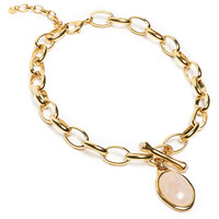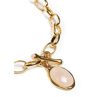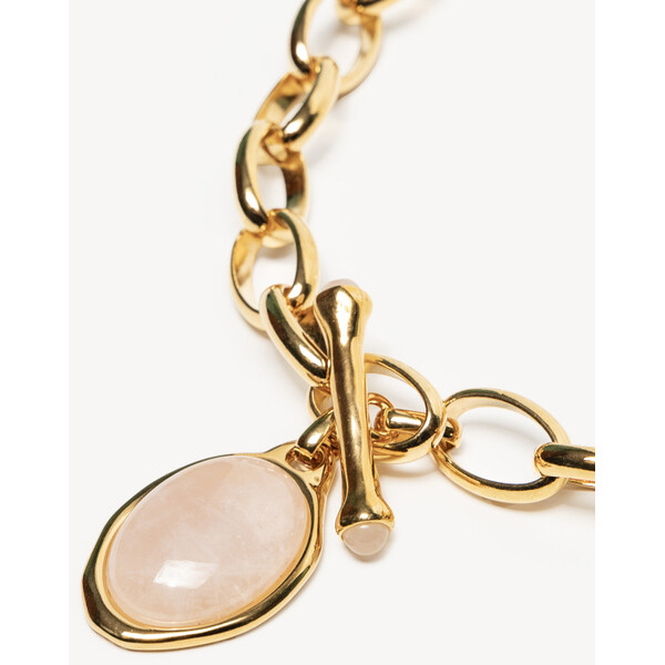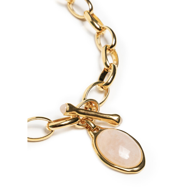 Naszyjnik z różowym kamieniem i ozdobnym zapięciemWyjątkowy naszyjnik wykonany z grubych ogniwek łańcucha platynowanego 24-karatowym złotem to propozycja łącząca nowoczesny charakter z subtelną nutą romantyzmu. Mimo mocnej, wyrazistej formy pozostaje lekki i wygodny w noszeniu.Centralnym punktem jest duży, eliptyczny kamień w różowym odcieniu, oprawiony w złoty otok, który pięknie kontrastuje z blaskiem metalu. Najciekawszym detalem jest frontowe zapięcie w formie ozdobnego kołeczka, wykończonego małymi kamieniami na końcach, co nadaje całości niepowtarzalnego uroku. Długość naszyjnika można regulować dzięki drugiemu, klasycznemu zapięciu umieszczonemu z tyłu.Cechy produktu:Materiał: metal platynowany 24-karatowym złotemDetale: duży eliptyczny kamień w różowym kolorze, złota oprawaZapięcie: frontowe ozdobne z małymi kamieniami + klasyczne regulowane z tyłuStyl: mocny, nowoczesny design inspirowany romantyczną biżuteriąLekkość: efektowny wygląd bez utraty komfortu noszeniaPropozycja stylizacji:Noś naszyjnik jako główną ozdobę do prostej, jednokolorowej sukienki w odcieniu czerni, bieli lub pudrowego różu – pozwoli to wyeksponować jego wyjątkowy design. W komplecie z bransoletką i kolczykami z tej samej serii stworzy efektowny, elegancki zestaw biżuteryjny. STOP METALI, PAT. 24K ZŁOTEM, KAMIEŃ NATURALNY