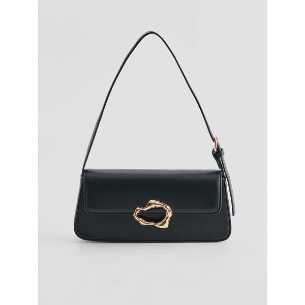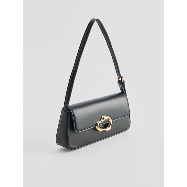 metalowe detale w złotym kolorzeCzarna torebka na ramię z klapką i złotym ozdobnym zapięciem.Torebka bagietka ze sztucznej skóry z regulowanym paskiem. Wewnątrz ma podszewkę z małą kieszonką na drobiazgi. Świetnie sprawdzi się na co dzień, jak i na eleganckie wyjścia.Wymiary produktu: 26 cm x 12,5 cm x 5 cm. kategorie-torebki-plecaki kategoria TORBY. Dostępny w rozmiarze One Size .