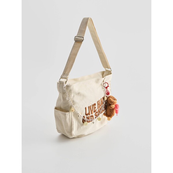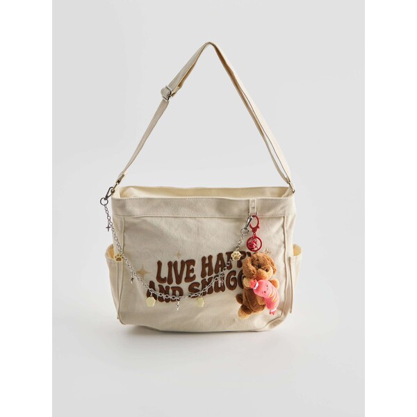 tekstowy haftmetalowe detale w srebrnym kolorzepasek z możliwością regulacji długościKremowa torebka z wyhaftowanym napisem Live Happy And Snuggly.Płócienna torebka z regulowanym paskiem. Jest zapinana na zamek, wewnątrz ma podszewkę z kieszonkami. Z boku ma dwie kieszonki. Ma dopięty łańcuszek z chamsami i brelokiem z misiem, co dodaje jej cute vibe'u.. kategorie-torebki-plecaki kategoria TORBY. KATEGORIE - TORBY DUŻE TORBY. Dostępny w rozmiarze One Size .