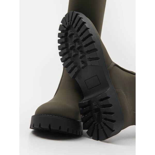 Rodzaj kozaki. Obcas płaski. Podeszwa na traktorze. Zapięcie wsuwane. Nosek okrągły. Cholewka tworzywo sztuczne. Wkładka tworzywo sztuczne. Wyściółka tworzywo sztuczne. Ocieplenie bez ocieplenia. Szerokość standardowy. Wodoodporne nie. Sezon jesień, zima. Cechy za kostkę. Wzór gładki. Kolor khaki. Przeznaczenie codzienne, outdoorowe. Styl casual, klasyczny. Produkt buty. Dział Kobieta. Okazja na co dzień. Dostępny w rozmiarach 36 37 38 39 40 41 .