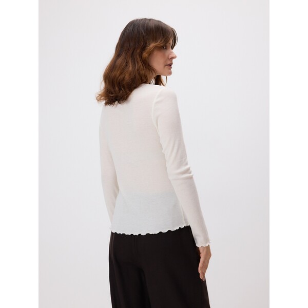 Bluzka o dopasowanym kroju, wykonana z dzianiny z wełną.okrągły dekoltdługie, dopasowane rękawyprązkowany wzór na całości. Krój dopasowane. Cechy długi rękaw, dekolt okrągły, premium quality. Wzór prążkowany. Materiał wełna. Rodzaj bluzka. Dostępny w rozmiarach L M S XL XS .