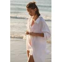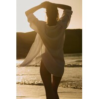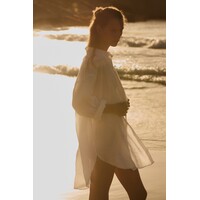 Długa luźna koszula z przewiewnej lnianej tkaniny. Kołnierzyk, zapięcie na guziki. Obniżone ramiona i długie rękawy z zapinanym mankietem. Zaokrąglony dół.