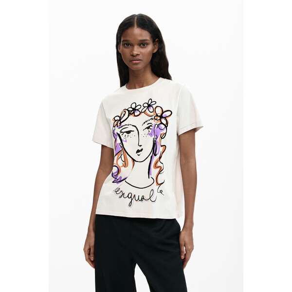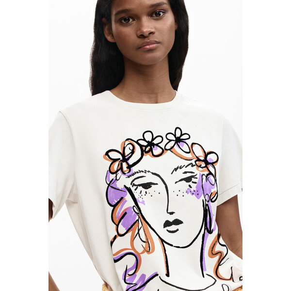 Szczegóły produktu T-shirt z dzianiny z przednim nadrukiem kobiecej twarzy i kwiatem we włosach. Okrągły dekolt i krótki rękaw. Dzianina z mieszanki bawełny i elastanu.Fason: RegularDzianinaPrzedni nadruk graficznyOkrągły dekoltKrótki rękaw SKU: 26SWTKXK1000 Product Sustainability Better Cotton Skład i wskazówki dotyczące pielęgnacji Skład części wewnętrznej: 100% BAWEŁNA Wysyłka i zwroty Wysyłka: Bezpłatna wysyłka od 250 ZŁ. Zwroty: Masz 30 dni na zwrot produktów. Jak dokonać zwrotu? *Z wyjątkiem bielizny i strojów kąpielowych. Cechy środowiskowe Produkcja: India Dostępny w rozmiarach L M S XL XS .