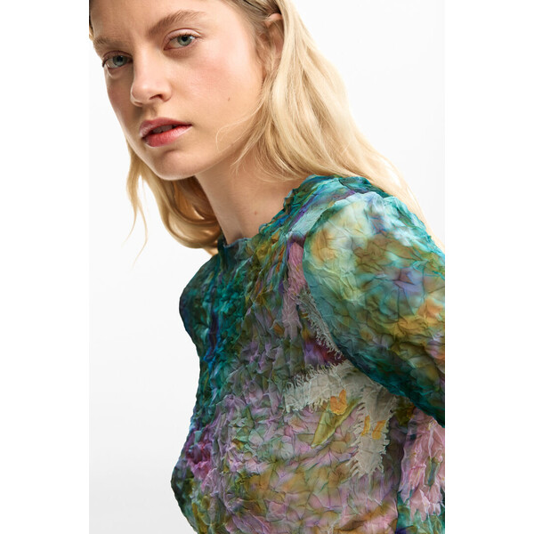 Szczegóły produktu Bluzka z teksturowanej tkaniny z cyfrowym nadrukiem kwiatowym na całej powierzchni. Ma okrągły dekolt i długi rękaw ze ściąganymi mankietami. Krój regularny i design w kolorze mineralnego błękitu.Fason: regularnyTeksturowana tkaninaCyfrowy nadruk kwiatowyOkrągły dekoltDługi rękaw ze ściąganymi mankietamiKolor mineralny błękitMateriał główny: 100% poliester z recyklingu SKU: 26SWBW125020 Product Sustainability Recycled Content Skład i wskazówki dotyczące pielęgnacji Skład części wewnętrznej: 100% POLIESTER Wysyłka i zwroty Wysyłka: Bezpłatna wysyłka od 250 ZŁ. Zwroty: Masz 30 dni na zwrot produktów. Jak dokonać zwrotu? *Z wyjątkiem bielizny i strojów kąpielowych. Cechy środowiskowe Tkanie: China Farbowanie i drukowanie: China Produkcja: China Uwalnia mikrowłókna z tworzyw sztucznych do środowiska podczas prania Dostępny w rozmiarach L M S .