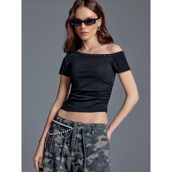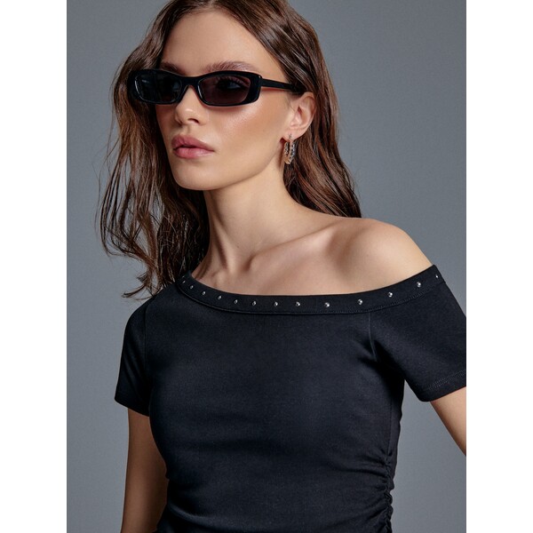 dopasowany fasonkrótki rękawmetalowe detale w srebrnym kolorzeo wysokiej zawartości bawełnyCzarna koszulka z asymetrycznym dekoltem odsłaniającym ramię.Koszulka damska z którtkim rękawem i dekoltem na jedno ramię, który ozdobiono metalowym dżetami. W talii ma akcentujące ją marszczenia, a dół po prawej stronie jest lekko dłuższy, co urozmaica jej shape. Ta koszulka świetnie sprawdz się w lookach nawiązujecych do estetyki Y2K.Gramatura materiału: 220 gsmModelka prezentuje produkt w rozmiarze: S/36. Wzrost modelki 171 cm. Materiał bawełna. Wzór gładkie. Fason dopasowane. kategorie-koszulki koszulki Z KRÓTKIM RĘKAWEM. Dekolt w łódkę. Dostępny w rozmiarach L M S XS .