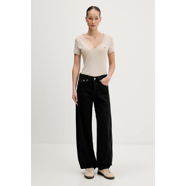 Beżowy T-shirt Tommy Jeans – prążkowana bawełna i dekolt w serek dla casualowych stylizacjiBeżowy T-shirt Tommy Jeans to damski T-shirt, który łączy w sobie komfort noszenia z modnym designem. Wykonany z elastycznej, prążkowanej bawełny, sprzyja dopasowaniu do sylwetki, a dekolt w serek dodaje mu subtelnego charakteru. Ten model stanowi świetną bazę dla wielu casualowych stylizacji, oferując wygodę i swobodę ruchów.Czym wyróżnia się damski bawełniany z elastanem T-shirt Tommy Jeans?Krój slim fit sprzyja podkreśleniu sylwetki, oferując modny i dopasowany wyglądKlasyczny T-shirt to uniwersalna baza, która pasuje do wielu różnorodnych zestawieńMiękka bawełna z elastanem pozwala na komfort noszenia i swobodę ruchów przez cały dzieńElastyczna dzianina sprzyja idealnemu dopasowaniu do ciała, nie krępując ruchówDekolt w serek optycznie wydłuża szyję, dodając stylizacji lekkości i kobiecościPrążkowana faktura materiału nadaje koszulce nowoczesny charakter i ciekawy wyglądCechy produktuElastycznośćelastyczny materiałDane produktuKod producentaDW0DW17385KolorbeżowyMarkaTommy JeansID ProduktuPPYH-TSD03B_80XMateriałCały produkt:95% Bawełna, 5% ElastanKrójDekolt: w serekKrój: slim fitRodzaj rękawa: dopasowanyWymiaryDługość z przodu: 57 cmSzerokość pod pachami: 40 cmWymiary podane dla rozmiaru: STabela rozmiarów Dostępny w rozmiarach L M S XS XXS .