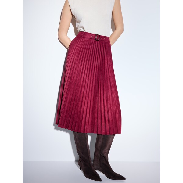 Spódnica o kroju litery A i długości midi, z paskiem. Uszyta z imitacji zamszu.krój litery Adługość midipasek w komplecieozdobne plisowaniaimitacja zamszuModelka prezentuje produkt w rozmiarze S/36. Wzrost modelki 177 cm. Wzór gładkie. Krój o kroju litery A. side_menu_skirts midi, maxi skirts. Długość midi. Dostępny w rozmiarach 32 34 36 38 40 42 .