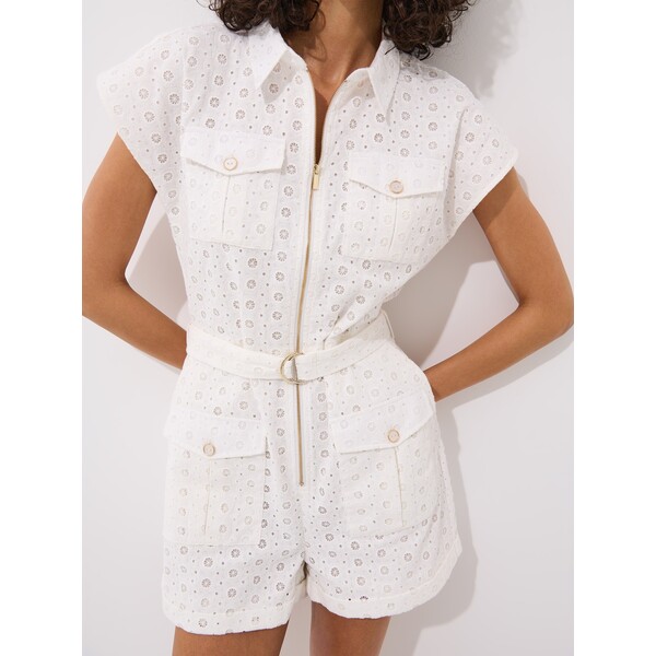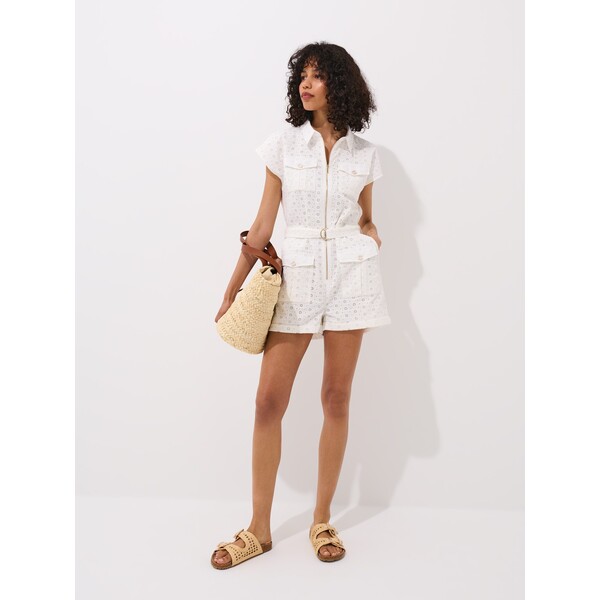 Bawełniany kombinezon z zapięciem na zamek z przodu i paskiem w talii.krótkie rękawyzapięcie na zamekkrótkie nogawkiażurowe zdobienia100% bawełnaModelka prezentuje produkt w rozmiarze S/36. Wzrost modelki 180 cm. Materiał bawełna. Krój kombinezon. dress-characteristics krótki rękaw. Wzór gładkie. side_menu_dresses kombinezon, summer dress, spring dresses. Dostępny w rozmiarach 32 34 36 38 40 42 .