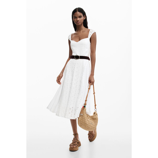 Szczegóły produktu Sukienka na ramiączkach, o kroju midi z dekoltem w kształcie serca, z gumką do dopasowania z tyłu i haftami.Kolor: Gładki Fason: SlimDekolt: W kształcie sercaNa ramiączkach Długość: Midi Gumka z tyłu Projekt z ozdobnymi ażurowymi wstawkami Dopasowane szwy boczneUszyta z materiałów zrównoważonych Kolekcja SS26Zaprojektowano w Barcelonie SKU: 26SWVK221000 Product Sustainability Better Cotton Skład i wskazówki dotyczące pielęgnacji Skład części wewnętrznej: 100% BAWEŁNA Skład części zewnętrznej: 100% BAWEŁNA Trimming fabric Material: 100% POLIESTER Wysyłka i zwroty Wysyłka: Bezpłatna wysyłka od 250 ZŁ. Zwroty: Masz 30 dni na zwrot produktów. Jak dokonać zwrotu? *Z wyjątkiem bielizny i strojów kąpielowych. Cechy środowiskowe Produkcja: Morocco Dostępny w rozmiarach L M S XL XS .