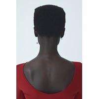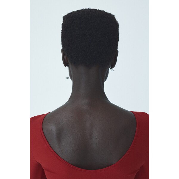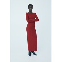 Długa sukienka z elastycznego dżerseju z widocznymi szwami profilującymi z przodu i z tyłu. Okrągły dekolt z głębokim wycięciem z tyłu, bardzo długie obcisłe rękawy z laserowo ciętym brzegiem. Szwy boczne przesunięte do przodu i szew biegnący wokół rękawów, który podkreśla sylwetkę. U dołu prosty brzeg i długie rozcięcie z tyłu. Dostępny w rozmiarach L M S XL XS XXL .