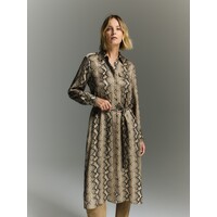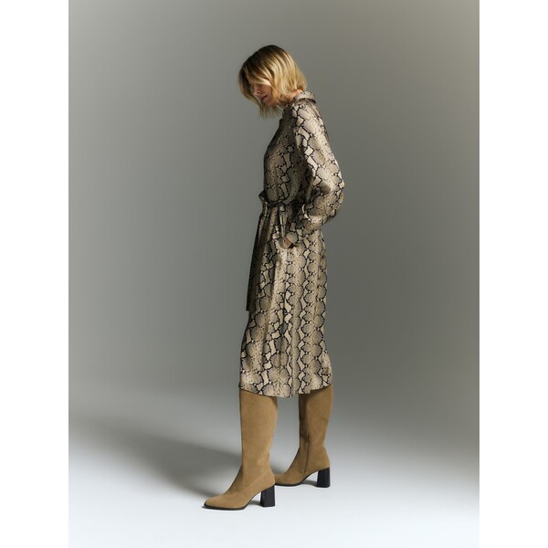 Sukienka midi o prostym kroju, wykonana ze wzorzystej tkaniny z wiskozy.koszulowy kołnierzykpagony na ramionachdługie rękawy z mankietamizapięcie na guzikiszeroki wiązany pasek w taliidwie klapki z przoduzwierzęcy wzórLimitowana kolekcja PREMIUM, dostępna w sklepie internetowym oraz w wybranych salonach. 100% WISKOZA COMING SOON Dostępny w rozmiarach L M S XL XS .