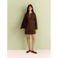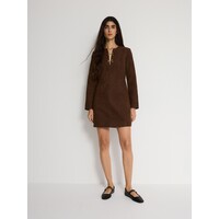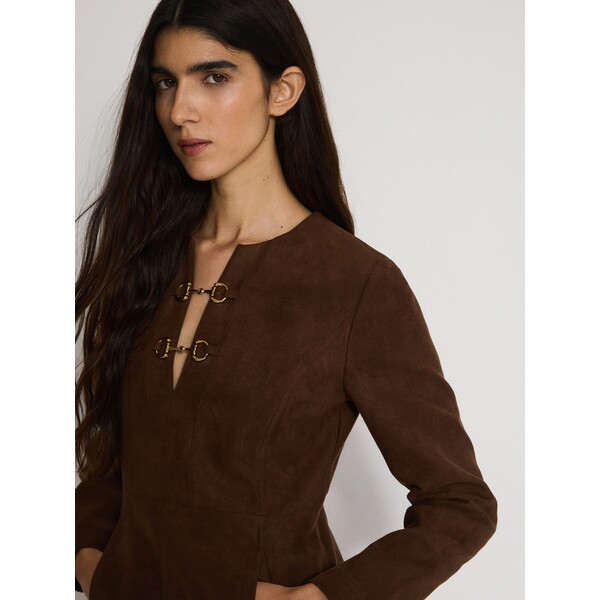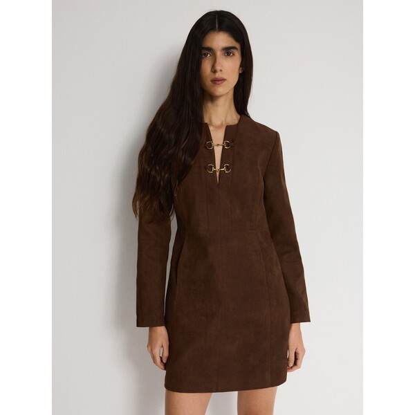 Sukienka o prostym kroju, wykonana z imitacji zamszu.dekolt V z ozdobnym elementemzapięcie z tyłu na zamekdługie rękawykieszeń na przodziedługość miniKolekcja limitowana, dostępna w e-sklepie oraz w wybranych salonach. 100% POLIESTER Dostępny w rozmiarach L M S XS .
