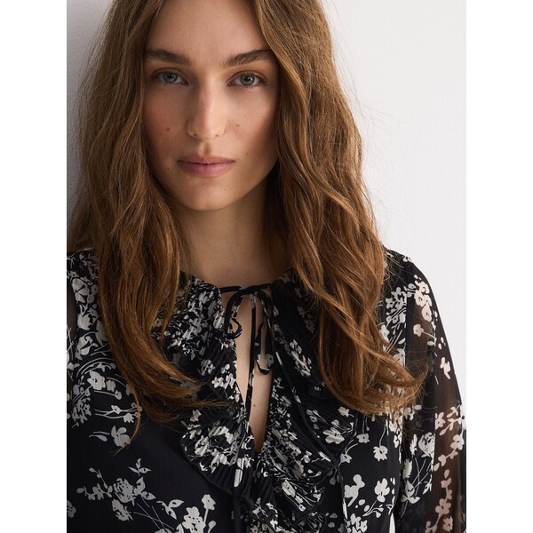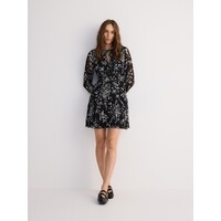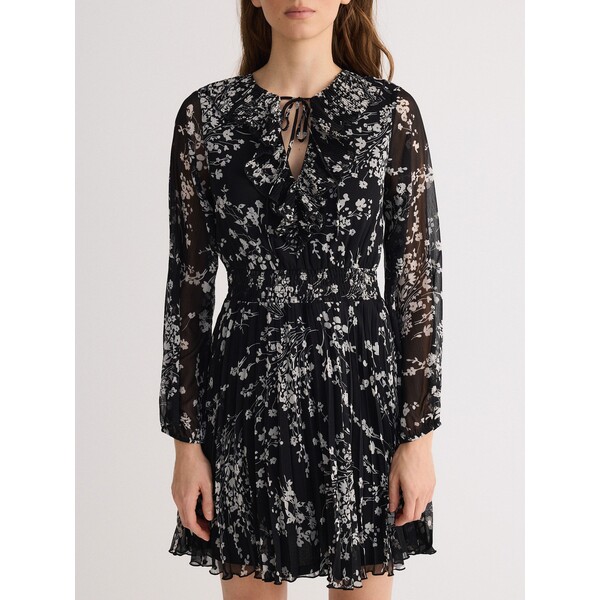 Sukienka o lekko rozkloszowanym kroju, wykonana z tkaniny.dekolt V z ozdobnym wiązaniemdługie, swobodne rękawyelastyczna gumka w taliiwzór w kwiaty na całościdługość mini 100% POLIESTER Dostępny w rozmiarach L M S XL XS .