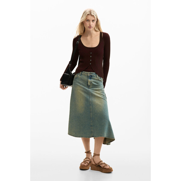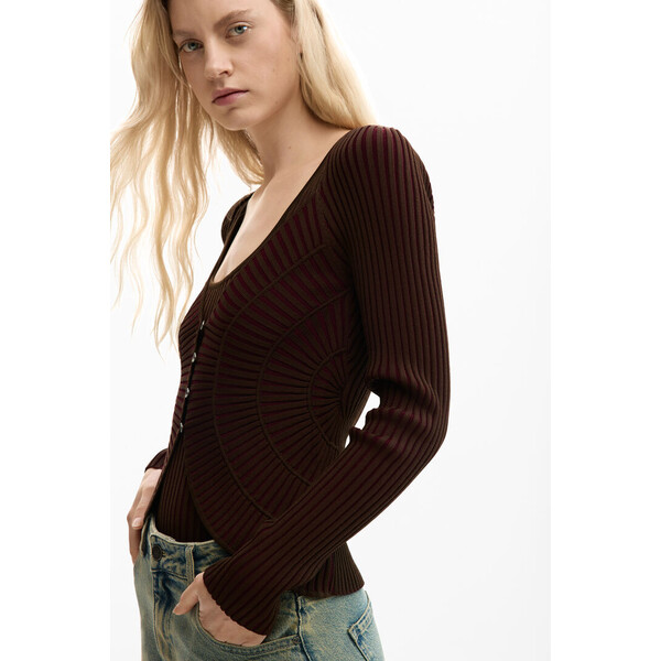 Szczegóły produktu Cienki brązowy sweter dzianinowy z dekoltem typu łódka i guzikami z przodu. Długie rękawy z dopasowanymi mankietami i gładka dzianina. Fason regular oraz zapięcie na guziki.Fason: regularCienka dzianinaGładki brązowy kolorDekolt typu łódkaDługi rękawZapięcie na guziki Wymiary modela: Wzrost: 180 cm; Talia: 64 cm; Biodra: 90 cm Rozmiar modelki: M SKU: 26SWJFXD6000 Skład i wskazówki dotyczące pielęgnacji Skład części wewnętrznej: 63% WISKOZA, 37% POLIAMID Wysyłka i zwroty Wysyłka: Bezpłatna wysyłka od 250 ZŁ. Zwroty: Masz 30 dni na zwrot produktów. Jak dokonać zwrotu? *Z wyjątkiem bielizny i strojów kąpielowych. Cechy środowiskowe Tkanie: China Farbowanie i drukowanie: China Produkcja: China Produkt zawierający co najmniej 0% materiałów pochodzących z recyklingu Dostępny w rozmiarach L M S .