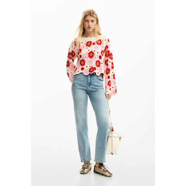 Szczegóły produktu Długi sweter z rozszerzanymi rękawami i okrągłym dekoltem z otwartym szydełkowym wzorem, tworzącym kształty kolorowych kwiatów.Kolor: WielokolorowyKrój: Krótki (cropped)Dekolt: OkrągłyRękaw: DługiDzianina szydełkowaKontrastowy nadruk kolorystycznyDół w falisty kształtKolekcja SS26Zaprojektowano w Barcelonie SKU: 26SWJF381001 Product Sustainability Better Cotton Skład i wskazówki dotyczące pielęgnacji Skład części wewnętrznej: 60% BAWEŁNA, 40% AKRYL Wysyłka i zwroty Wysyłka: Bezpłatna wysyłka od 250 ZŁ. Zwroty: Masz 30 dni na zwrot produktów. Jak dokonać zwrotu? *Z wyjątkiem bielizny i strojów kąpielowych. Cechy środowiskowe Tkanie: China Farbowanie i drukowanie: China Produkcja: China Dostępny w rozmiarach L M S .